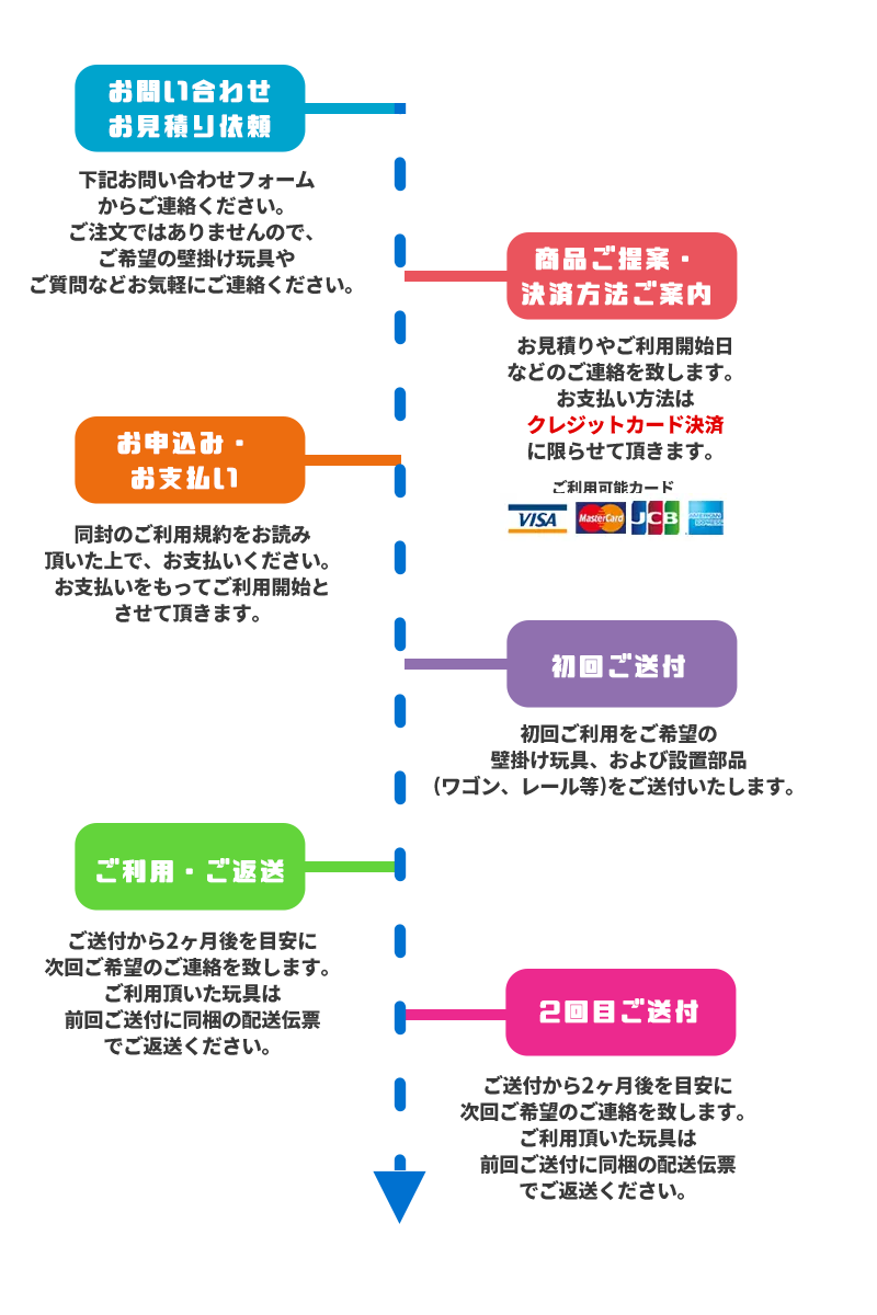 お子様は元気いっぱいに遊ぶもの。遊んでいる最中に壊れてしまったとしても、レンタル契約なら無料で交換対応させて頂きます。細かな条件についてはこちらをご確認ください。