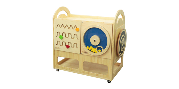 おもちゃ用ラックとしても利用できる木製ワゴン(キャスター付き)と壁掛け玩具14個のセット。壁掛け玩具は4つ取り付け可能で、2か月に1度2個ずつの交換となります。